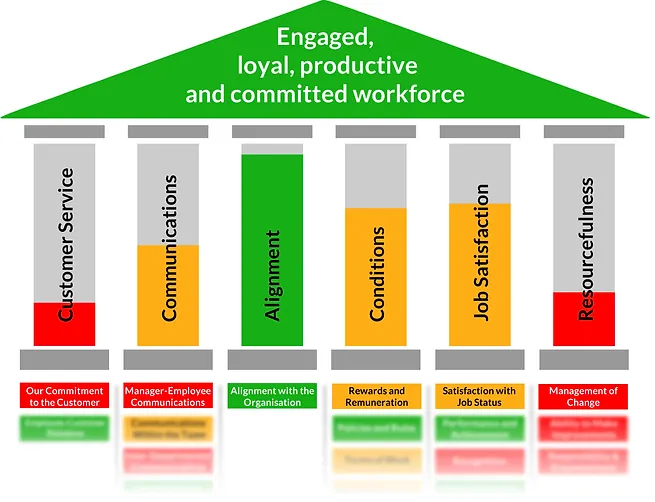 This survey and report is based on the 22 factors that reveal employee engagement and assesses the extent to which your leadership, management and team supports the full engagement of the employees.